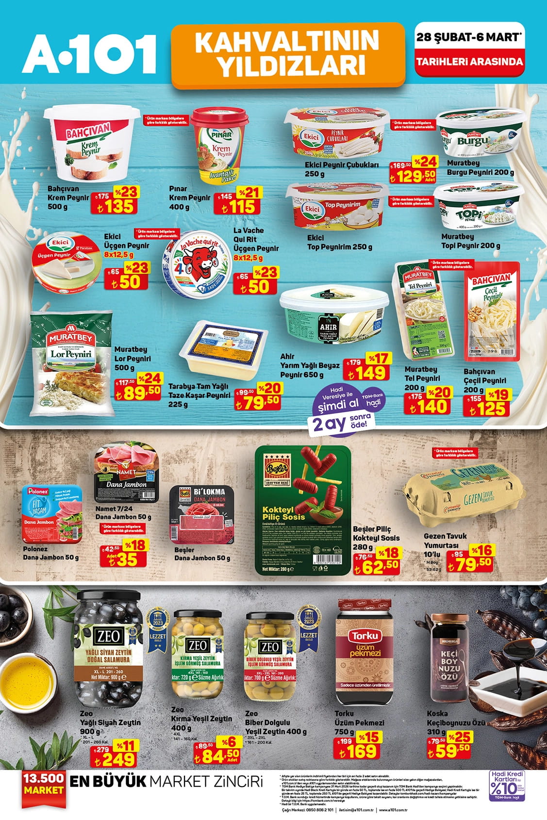 Ayçiçek yağı, zeytinyağı, kuru fasulye, domates salçası, toz deterjan, deodorant, kireç ve pas sökücü, süt, sucuk, tam yağlı eritme peyniri, tam yağlı homojenize yoğurt ve siyah çay gibi ürünlerin yer aldığı 6 Mart tarihine kadar geçerli olacak A101 kataloğu yayınlandı.