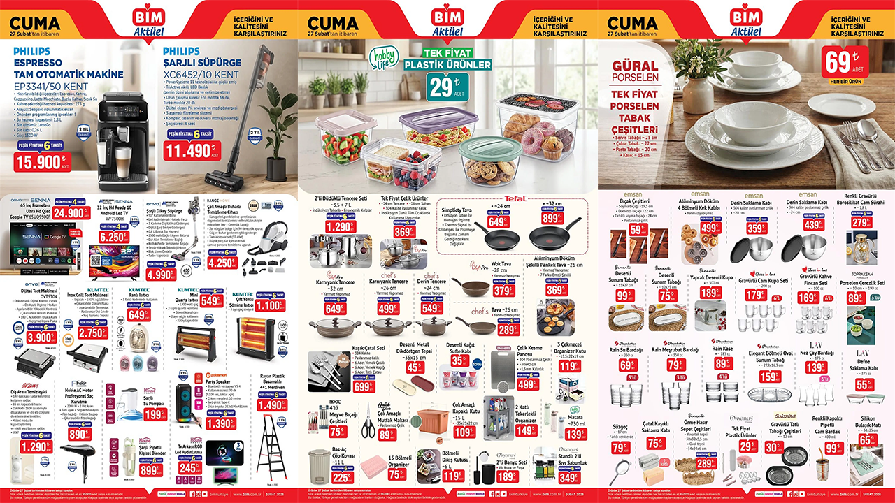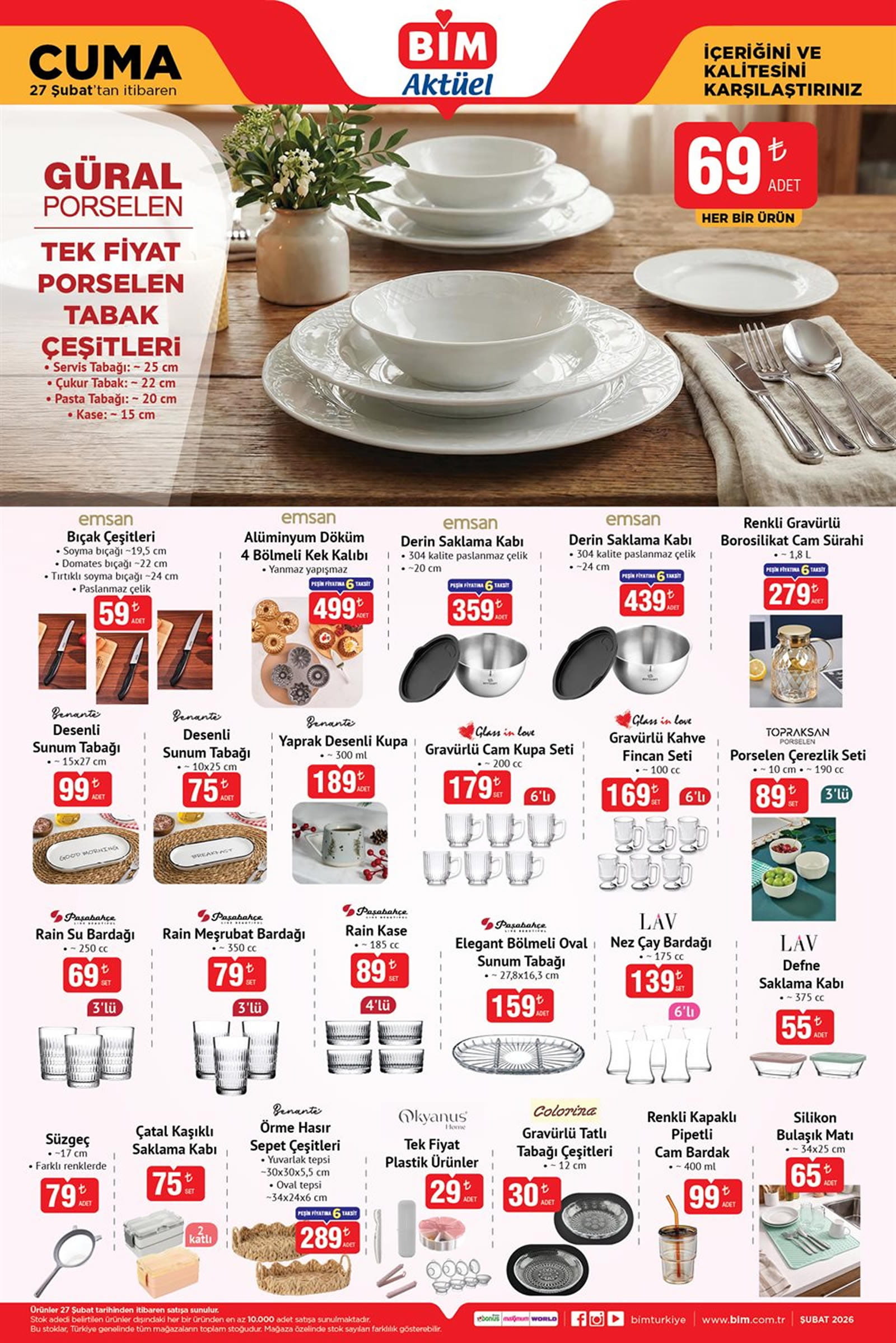 Düdüklü tencere seti, tek fiyat çelik ürünler, tava, tek fiyat plastik ürünler, kaşık çatal seti, çöp kovası, meyve bıçağı çeşitleri, mutfak makası, kapaklı kutu, tekerlekli organizer, matara ve çelik kesme panosu gibi ürünlerin yer aldığı 27 Şubat tarihinden itibaren geçerli olacak BİM kataloğu yayınlandı.