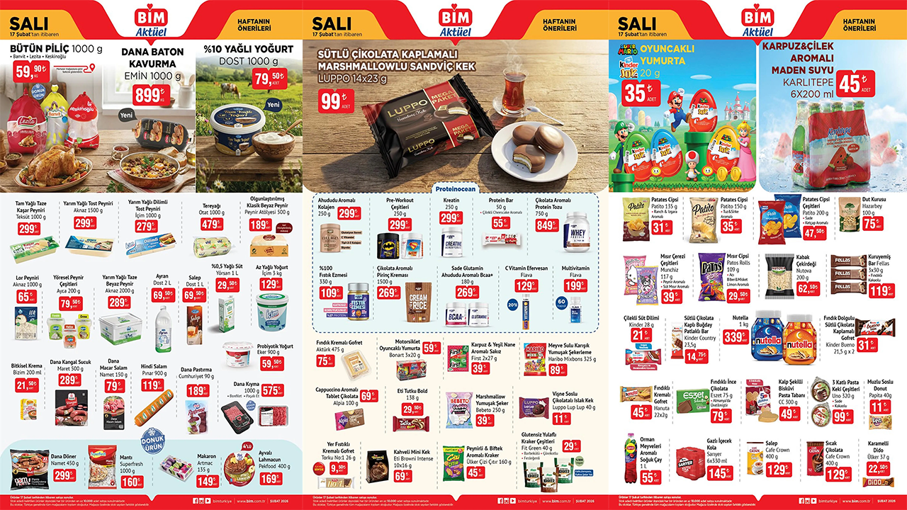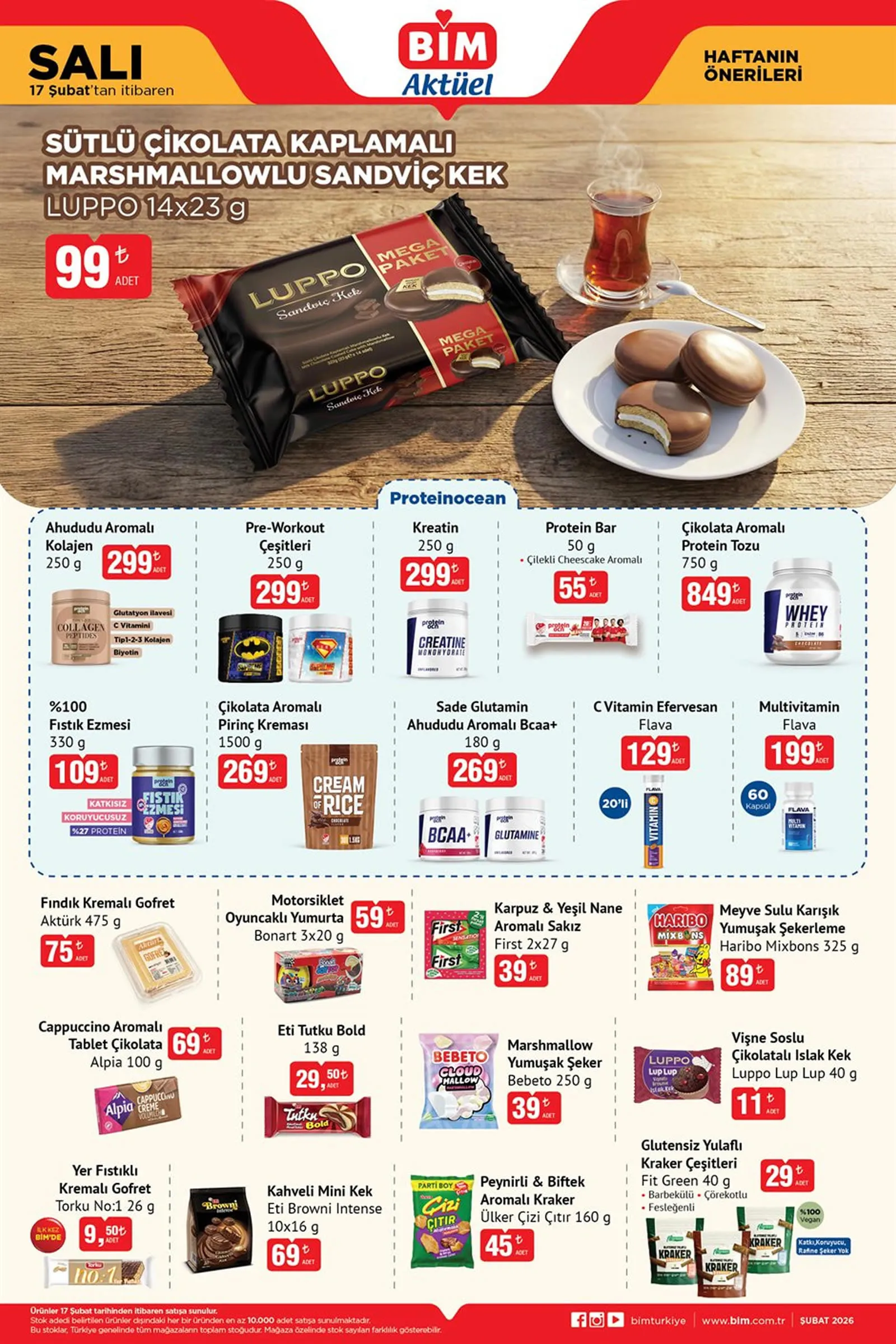 Fındık kremalı gofret, yer fıstıklı kremalı gofret, kahveli mini kek, yumuşak şeker, vişne soslu çikolatalı ıslak kek, protein bar, çikolata aromalı protein tozu, kreatin, ahududu aromalı kolajen ve fıstık ezmesi gibi ürünlerin yer aldığı 17 Şubat tarihinden itibaren geçerli olacak BİM kataloğu yayınlandı.