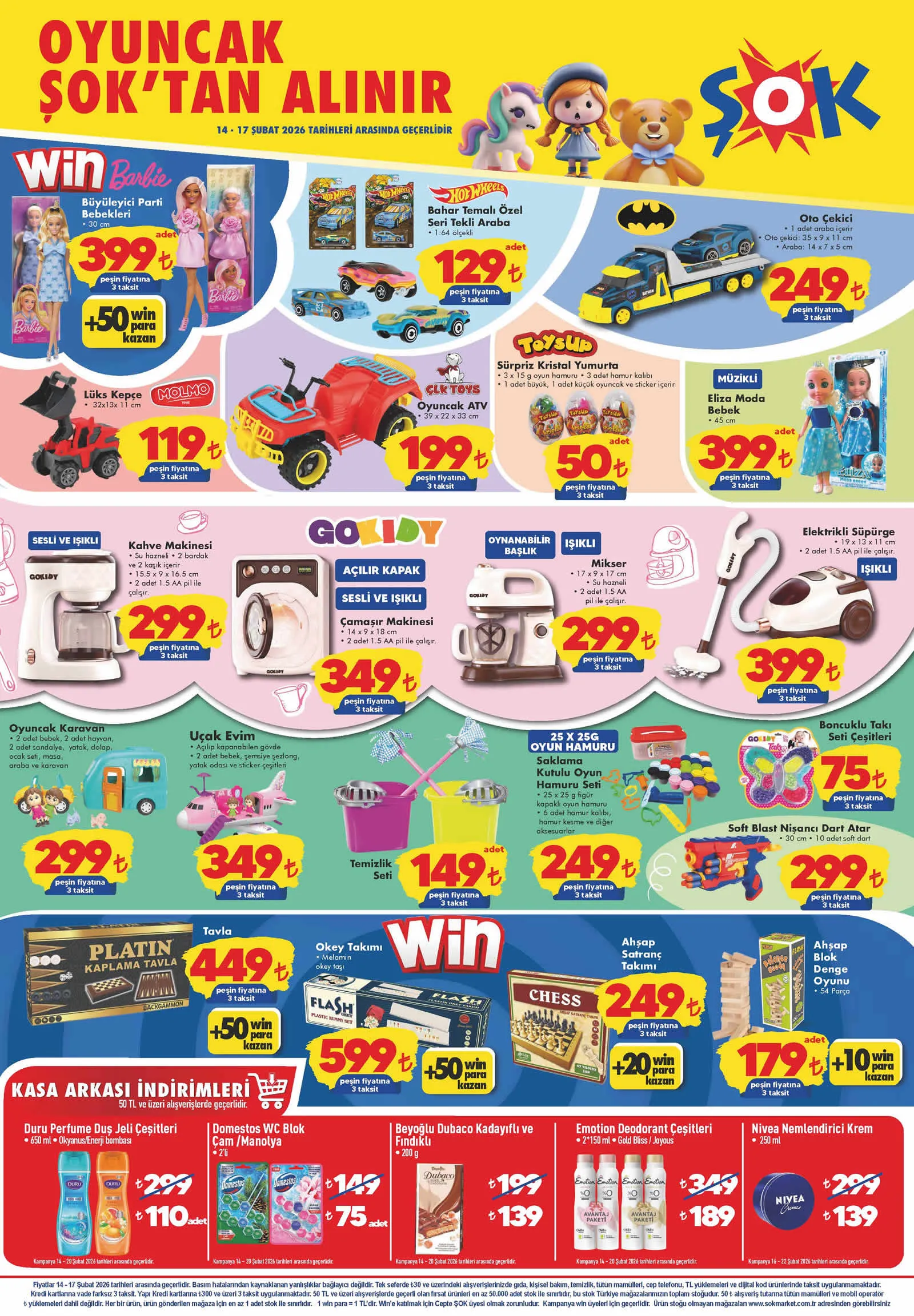 Duş jeli çeşitleri, çikolata, deodorant çeşitleri, nemlendirici krem, tavla, okey takımı, ahşap satranç takımı, ahşap blok denge oyunu, saklama kutulu oyun hamuru seti, temizlik seti, uçak evi, kahve makinesi, açılır kapaklı sesli ve ışıklı çamaşır makinesi, elektrikli süpürge, ısıtıcı, el tipi buharlı düzleştirici, yağlı radyatör ve bambu kapaklı kavanoz gibi ürünlerin yer aldığı 14 Şubat tarihinden itibaren geçerli olacak ŞOK kataloğu yayınlandı.