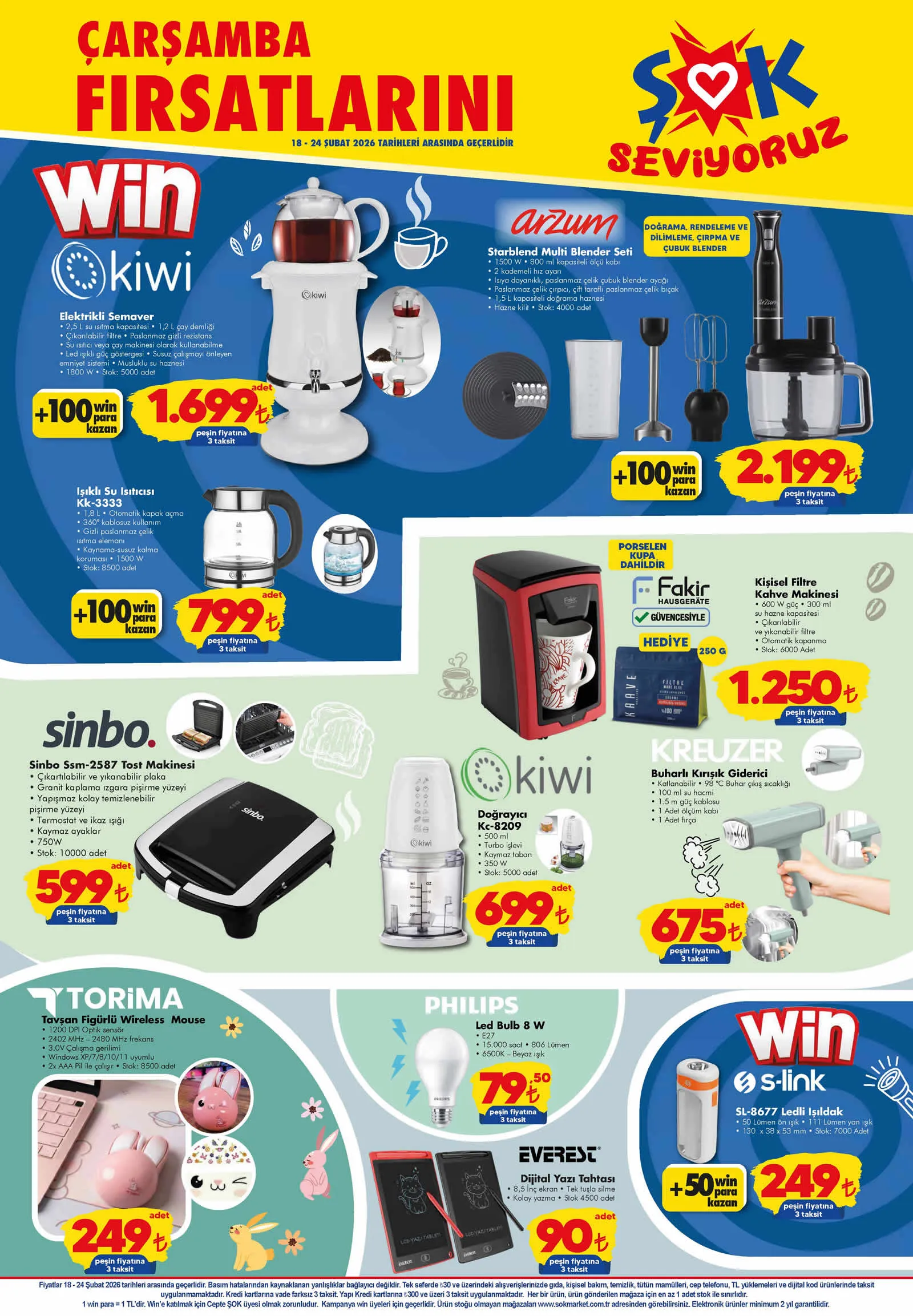 Dijital yazı tahtası, tost makinesi, doğrayıcı, buharlı kırışık giderici, filtre kahve makinesi, ışıklı su ısıtıcı, elektrikli semaver, sahan, silikon servis seti ve poşetlik gibi ürünlerin yer aldığı 18 Şubat tarihinden itibaren geçerli olacak ŞOK kataloğu yayınlandı.